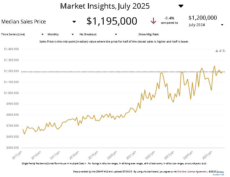 - Prices are down 0.4% from $1,200,000 last July.