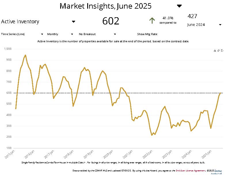 Inventory in the Conejo Valley has climbed 41% year-over-year, from 427 homes in June 2024 to 602 homes this June. That’s a significant jump, giving buyers more choices and sellers more competition.
