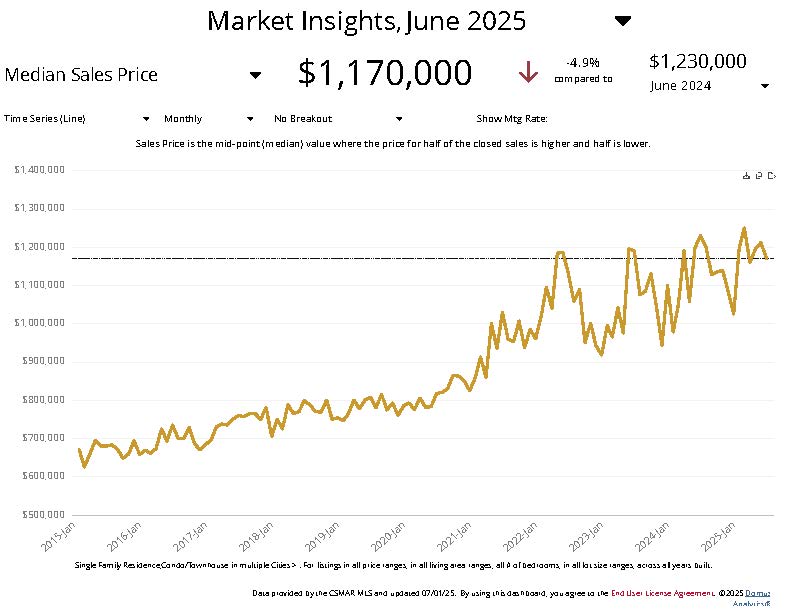 - Prices are down 4.9% from $1,230,000 last June.