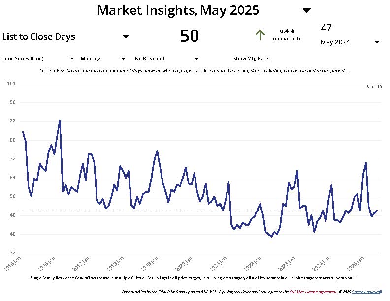 - A slower return of buyers: Listings are growing faster than buyer demand, shifting the market toward a more balanced—or even buyer-friendly—environment. A reduction in rates could see that change quickly.