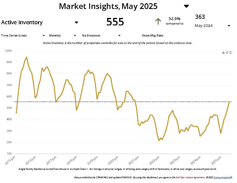 Inventory is Rising Fast. At the end of May, there were 555 homes for sale—the most we’ve seen in 5 years and up 53% from last year. But unlike five years ago, today’s higher home prices and mortgage rates are holding back demand.