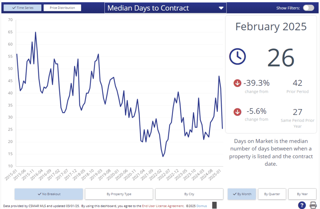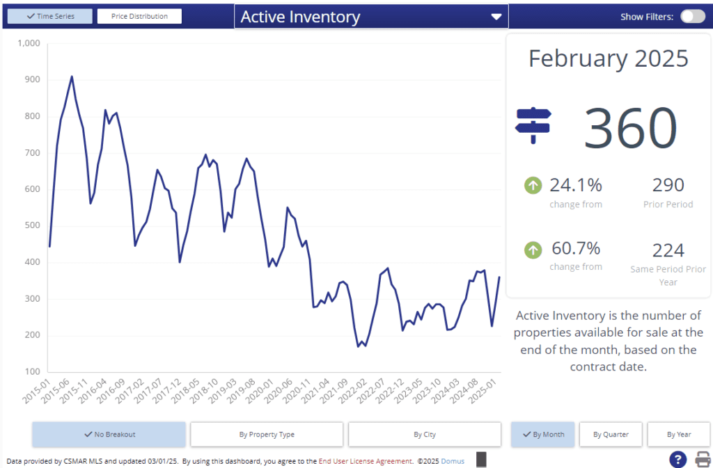 More homes are hitting the market—and staying there. In February alone, 263 new listings came up for sale (+67%), and by the end of the month, 360 homes remained on the market—a 60% increase over last year.