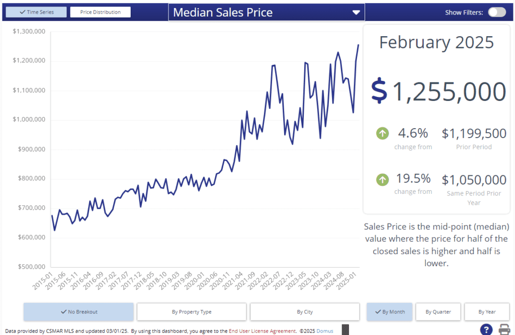 - The median price of a Conejo Valley home was up in February to $1,255,000.