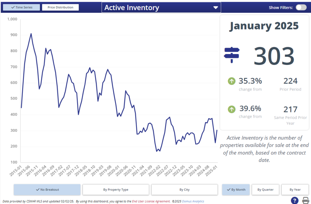 Meanwhile, housing inventory has been rising. At the end of January, 303 homes were on the market—up 40% from last year. Whether this trend continues remains to be seen, but an increase in demand could lead to more competition among buyers.