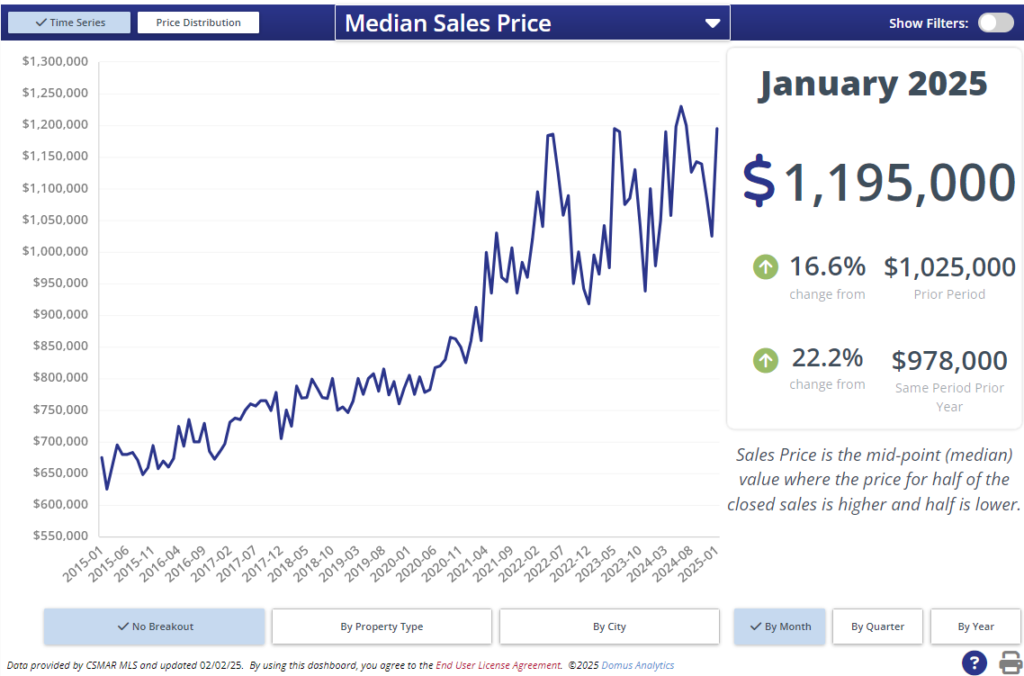- The median price of a Conejo Valley home was up in January to $1,195,000.